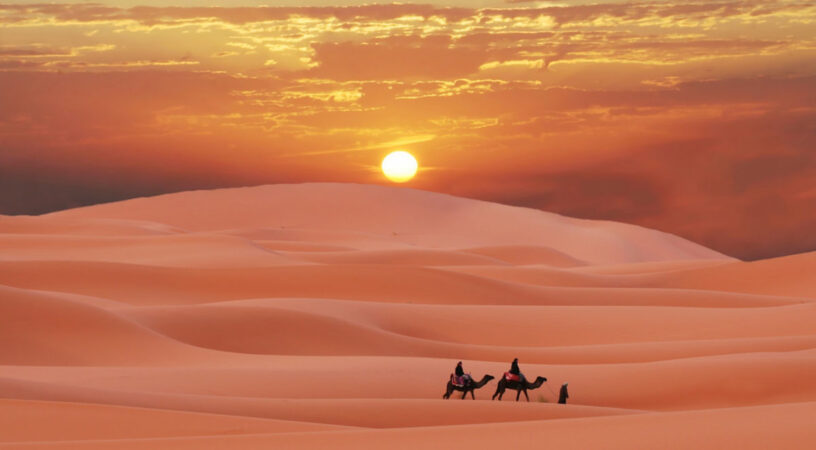 In the afternoon, travel through the scenic Ziz Valley and its volcanic gorges toward Erfoud, known for its fossils and dates. Upon arrival in Merzouga, you’ll trade your car for camels and ride across the dunes of Erg Chebbi at sunset—a magical moment as the sky turns shades of gold and pink.