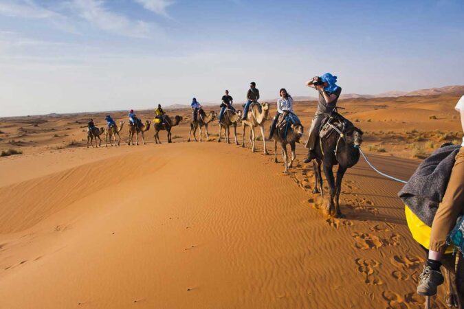 Today, explore the mesmerizing Sahara Desert. Visit Khamlia Village to experience traditional Gnawa music, meet nomadic families, and learn about desert life. Optional activities such as quad biking or sandboarding can be arranged. In the afternoon, ride camels across the dunes to your luxury desert camp, where you’ll enjoy a delicious dinner, Berber drumming around the campfire, and a night under the stars.